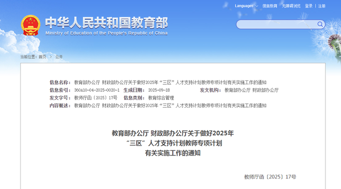 【环球网报道 记者 陈全】为贯彻落实《教育强国建设规划纲要(2024—2035年)》《中共中央 国务院关于弘扬教育家精神加强新时代高素质专业化教师队伍建设的意见》,加强新时代乡村教师队伍建设,按照《中共中央 国务院关于实现巩固拓展脱贫攻坚成果同乡村振兴有效衔接的意见》《教育部等五部门关于印发〈边远贫困地区、边疆民族地区和革命老区人才支持计划教师专项计划实施方案〉的通知》要求,教育部办公厅联合财政部办公厅发布《关于做好2025年“三区”人才支持计划教师专项计划有关实施工作的通知》(以下简称《通知》)。