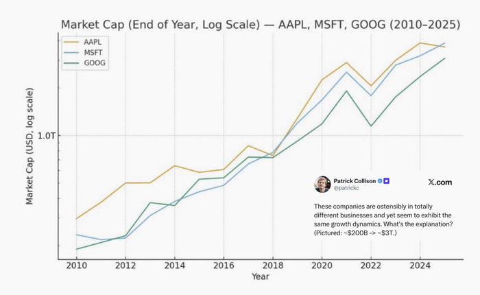 他发了一张图表,上面是苹果(AAPL)、微软(MSFT)和谷歌(GOOG)三家公司的市值增长曲线,从2010年到2025年,三条线几乎完美地平行飙升,从约2000亿美元的体量,一路狂奔至接近3万亿美元的巅峰。