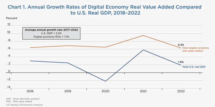 此外,2022年,在整体经济增长1.9%的背景下,数字经济的附加值增长了6.3%,在2013年至2022年的十年间,仅六个科技相关产业就贡献了美国经济增长的35%。