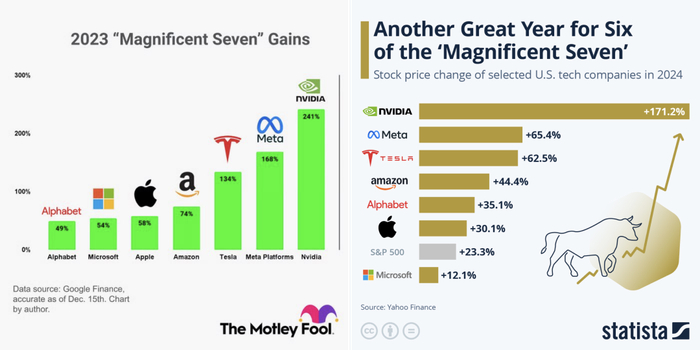 在2023年,这七家公司的集体回报率高达75.71%,而同期标普500指数的整体回报率为24.23%,2024年的表现也非常不俗。