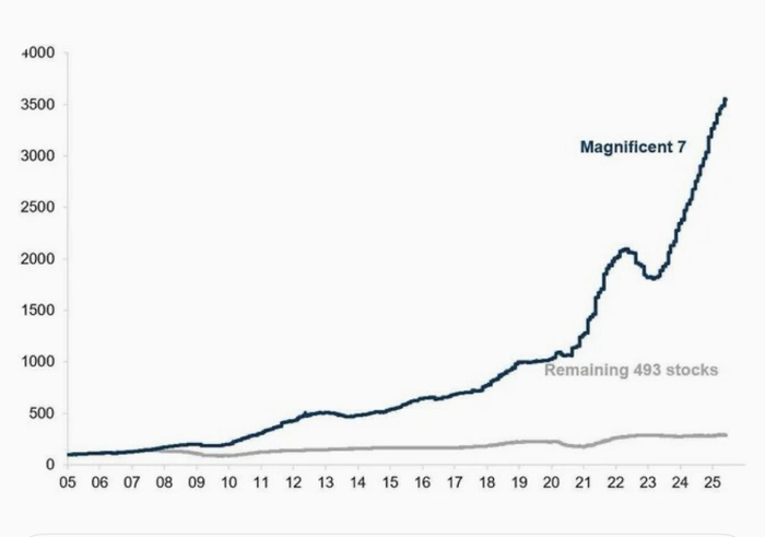 这张图比较了从2005年到2025年间,“科技七巨头”(Magnificent 7)与标准普尔500指数中其余493家公司的表现。结果令人瞠目结舌: