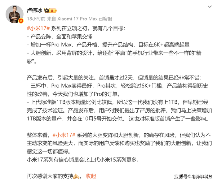 小米集团总裁卢伟冰也对其作出反驳,表示小米17系列首销虽然才过去两天,但销量结果已经非常不错。销量最好的是顶配ProMax版本,帮助小米成功卖过6000元产品门槛,今年也提升Pro系列订单,调整的只有标准版。由于上一代1TB版本销量占比较低,小米17最早没有1TB,版本遭到网友批评,官方立即增加1TB版本稍晚供货,这可能才是造成标准版早期销量不佳的原因。