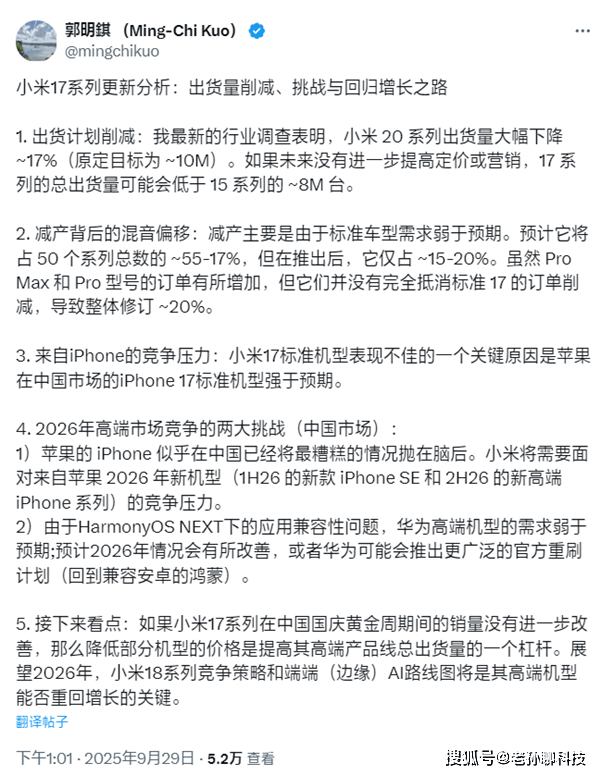 知名分析师郭明錤给出小米17系列销量分析,认为新机销量下滑17%左右,远没有达到原定10万台目标,甚至比小米15系列8万台目标还要低。小米目前正在削减小米17系列订单,修订范围在20%左右,销量糟糕主要原因是iPhone17系列销量强于预期,是销量表现糟糕还有华为手机,高端机型明显弱于苹果,需要做出重新应对。