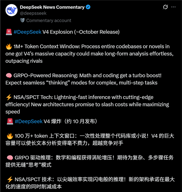 推上一个名为DeepSeek News Commentary的账号表示v4将于10月发布,带来100万上下文、GRPO驱动推理及NSA/SPCT等技术,数学、编程能力大幅提升,同时速度极快,成本也极低。