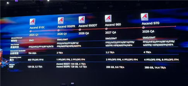 现在已经不少国产AI芯片宣布支持FP8算法了,但是这方面的适配显然需要一个领头羊,那就是华为昇腾,联系一下前几天的大约上华为高调宣布昇腾路线图,明年Q1时候的昇腾950PR不仅支持FP4,还支持FP4,算力达到1PFLOPS(FP8)/ 2PFLOPS(FP4),支持FP32/HF32/FP16/BF16/FP8/MXFP8 /HiF8/MXFP4/HiF4等数据格式,互联带宽为2TB/s,内存容量和带宽做到了144GB、4TB/s。