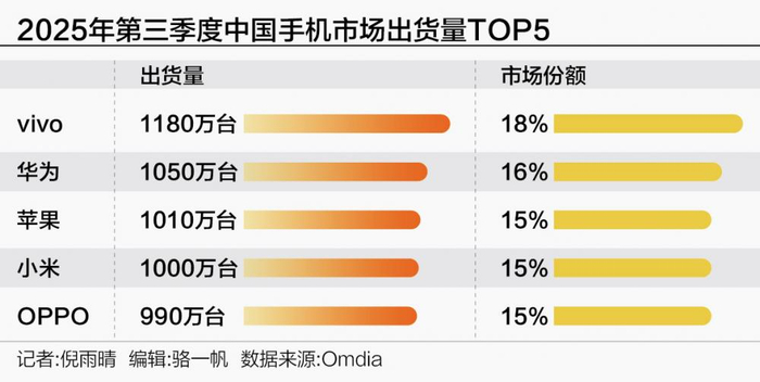 而头部厂商之间的差距进一步缩小,竞争继续保持白热化。根据Omdia数据,第三季度vivo以1180万台的出货量重回第一,占据18%市场份额。华为紧随其后排名第二,出货量1050万台,市场份额为16%。苹果延续上一季度的涨势,出货量1010万台,排名相较去年同期上升两位,跻身市场前三。小米出货1000万台,OPPO出货990万台,分别位列第四第五。