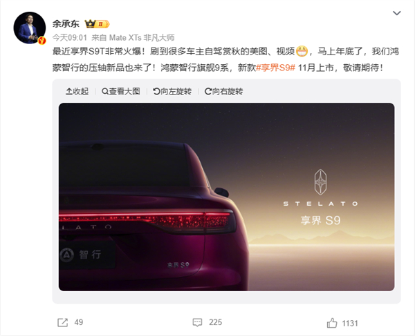 今日,余承东在微博宣布:马上年底了,鸿蒙智行的“压轴新品”旗舰9系——新款享界S9将于11月上市。