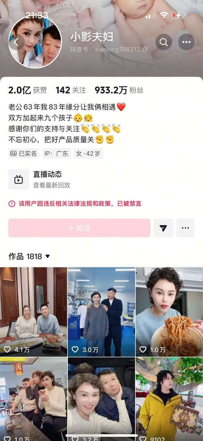 有着近千万粉丝的网红“小影夫妇”,其账号已被禁言。