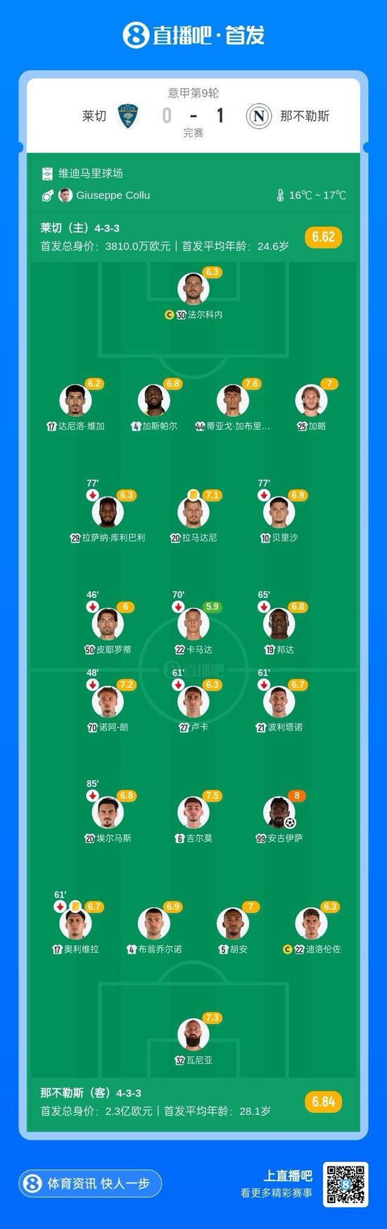 全场比赛结束,那不勒斯客场1-0战胜莱切。