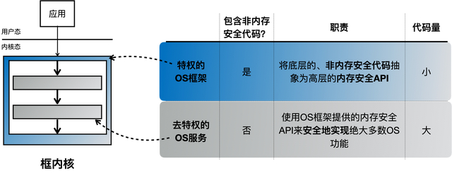 星绽的“框内核”架构,敏锐地抓住了Rust语言崛起的历史机遇,试图“鱼与熊掌兼得”。它将整个操作系统内核划分为两部分:特权的“OS框架”和去特权的“OS服务”。OS框架负责将底层非内存安全的Rust代码封装为高层次、内存安全的接口;而OS服务则完全使用Rust语言中的安全部分进行开发,构建操作系统的大部分功能模块。